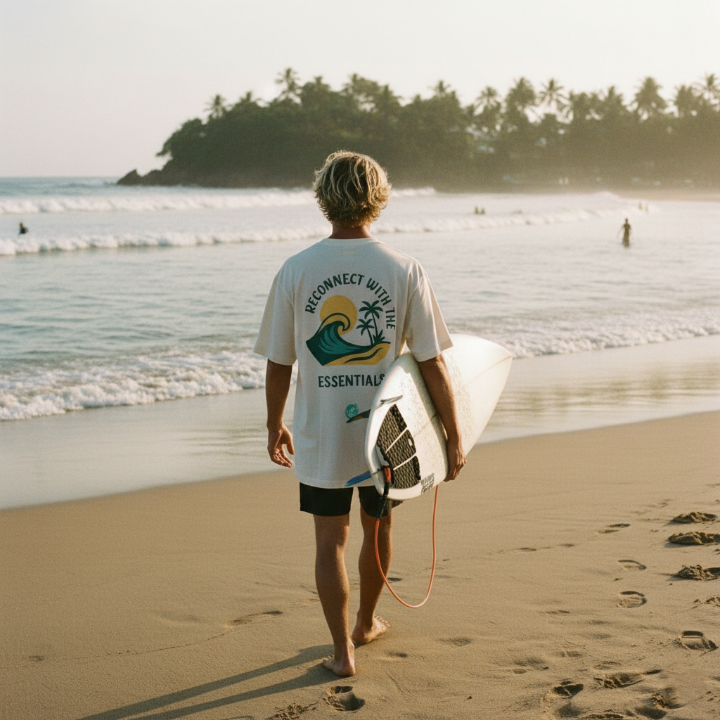 - Visuel : Grand visuel "Reconnect with the Essentials" au dos (palmiers, vague et soleil) + petit logo imprimé à l’avant